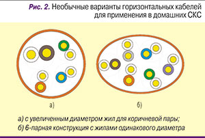 С прицелом на построение домашних сетей швейцарская компания BKS предложила 4-парный кабель, в котором коричневая пара имеет увеличенный диаметр жилы, но сохраняет при этом 100-омное волновое сопротивление (рис. 2а). Данный конструктивный прием позволяет снизить затухание той пары, которая традиционно задействуется для передачи телевизионных сигналов. В результате появляется возможность полноценной поддержки работы систем спутникового телевидения с верхней граничной частотой линейного спектра, равной 2,4 ГГц. Одновременно сохраняется универсальный характер проводки.