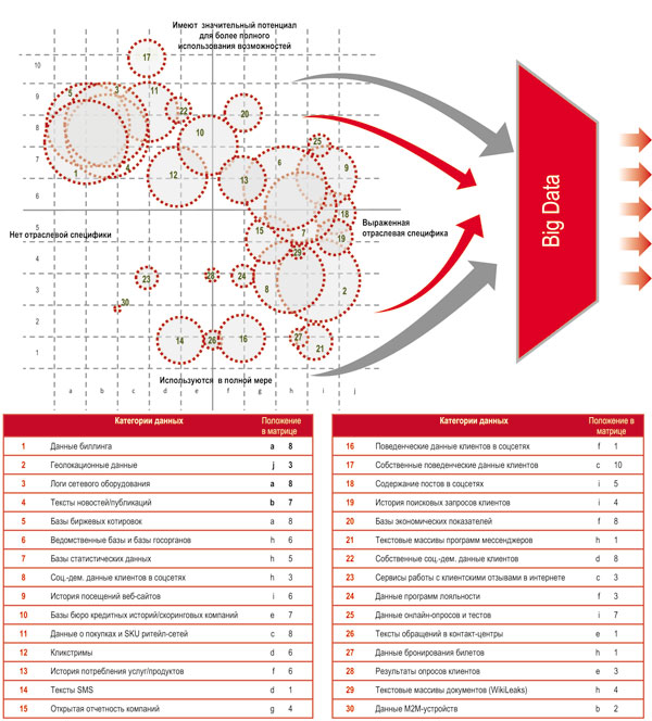 Эксперты iKS-Consulting провели комплексную оценку текущего применения технологий Big Data в компаниях и в результате изучения открытых источников, собственных данных компаний разного профиля, внутренних отчетных данных сформировали перечень категорий данных, наиболее часто используемых для решения бизнес-задач.