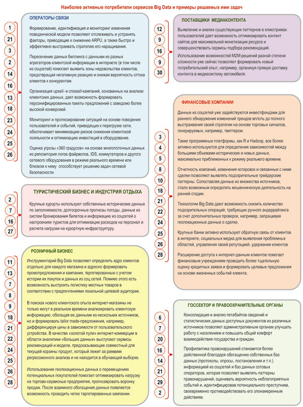 На диаграмме отражен масштаб использования в России данных, перечисленных в таблице. Среди тех, кто уже сегодня оценил коммерческую ценность трансформации данных, – операторы связи, финансовые, туристические компании, игроки ритейл-рынка, а также предприятия по добыче природных ископаемых.