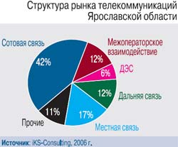Объем доходов от услуг связи в 2006 г. вырос в Ярославской области на 32% по сравнению с предыдущим годом и составил ровно $199 млн. В общефедеральном рейтинге ее место выглядит скромно: по объему услуг местный телекоммуникационный рынок находится лишь на 31-м месте, уступая многим регионам и Поволжья, и Сибири, да и других субъектов Федерации. Однако в Центральном федеральном округе ярославский рынок связи пропустил вперед только Москву, Московскую да Воронежскую области. Так что игрокам рынка связи, приоритетно осваивающим близкие к столице территории, целесообразно отдать должное этому звену Золотого кольца.