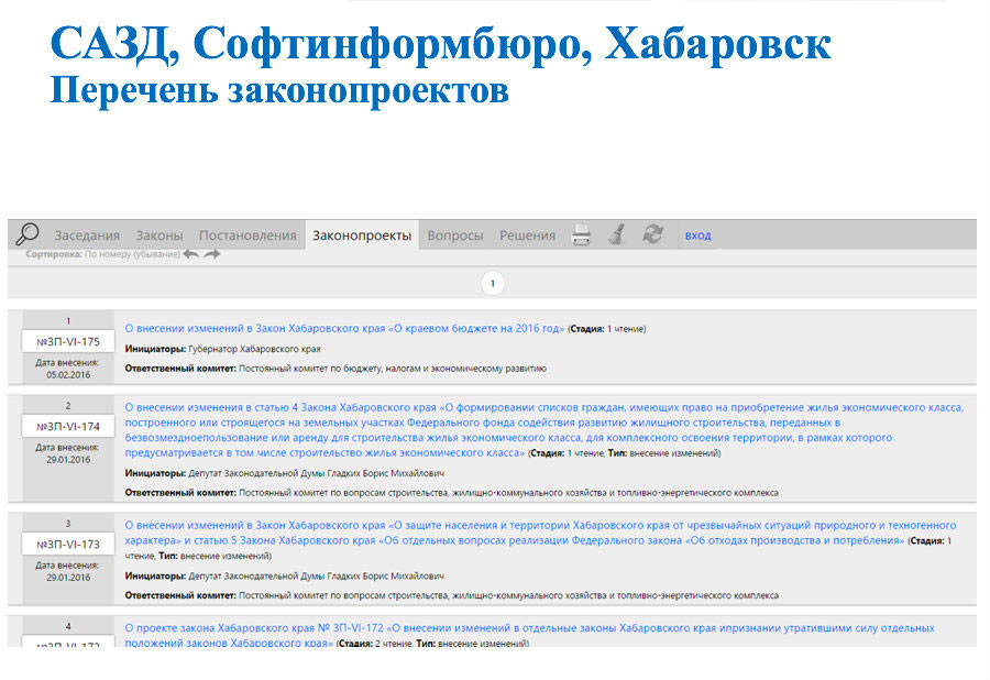 Из индивидуальной разработки выросло еще одно неплохое решение – САЗД (система автоматизации законотворческого документооборота) от компании «Софтинформбюро». В 2005 г. была написана первая версия программного комплекса для Законодательной Думы Хабаровского края. Через два года на ее основе было создано типовое решение САЗД, которое развернуто в Законодательном Собрании Приморского края, Думе города Владивостока и ряде других законодательных собраний РФ.