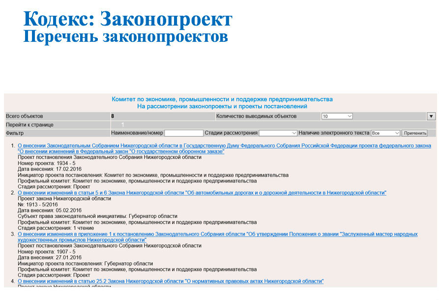 Еще одно, довольно давно существующее решение – АИС «Кодекс: Законопроект» (разработчик – консорциум «Кодекс»). Первоначально, в 2000 г., был создан банк документов законотворческой деятельности Законодательного Собрания Санкт-Петербурга. В 2002 г. функционал автоматизации законотворческого процесса был доработан. На данный момент АИС «Кодекс: Законопроект» работает в ЗакС Санкт-Петербурга и Нижегородской области, в Государственной Думе Ямало-Ненецкого автономного округа.