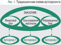 Самый сложный этап – заключение соглашения о предоставлении услуг аутсорсинга. При «классическом» аутсорсинге (рис. 1), когда передаются непрофильные бизнес-процессы и второстепенные функции (финансовоэкономическая деятельность, управление персоналом, учетная политика и ИТ), инициатива при составлении контракта принадлежит аутсорсеру, потому что представители заказчика не всегда достаточно подготовлены к корректному формулированию и постановке задач, квалифицированному отражению в договоре важных аспектов в непрофильных областях деятельности. При этом каждый аутсорсер взаимодействует со «своими» блоками заказчика, есть и целый ряд типовых юридических разработок, которые в ходе переговоров удается переработать под конкретный проект.