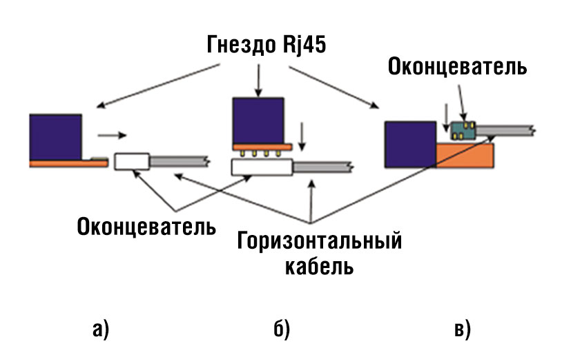 В этой области известны два основных решения. В первом из них используется модуль, состоящий из двух частей: гнезда под вилку и оконцевателя для подключения кабеля. Таким образом, соединитель и оконцеватель можно отсоединять друг от друга, а их связь в собранном состоянии осуществляется по различным схемам (рис. 1). Наибольшее распространение получила линейная схема (рис. 1а), которая еще в середине 90-х гг. прошлого столетия была положена в основу известной системы АСО компании АМР.