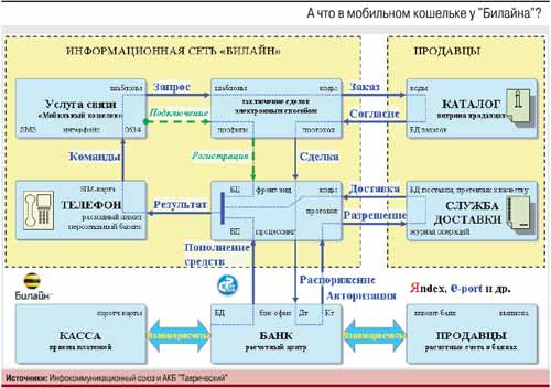 Реализованная «Билайном» схема, которая вписывается в рамки действующего законодательства, – ноу-хау банка «Таврический». Участниками расчетов с мобильного кошелька выступают клиент (который заключил с «ВымпелКомом» договор, предусматривающий совершение таких операций) и банк «Таврический». Задача оператора – оказывать услуги связи и обеспечивать информационное и технологическое взаимодействие между клиентом и банком: собирать, обрабатывать и рассылать участникам расчетов сообщения с информацией по операциям с картами.