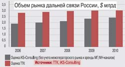 Задача на деление рынкаОфициальная дата отмены монополии на дальнюю связь в России – 1 января 2006 г. К тому моменту объем российского рынка междугородной и международной связи составлял, по разным оценкам, от $1,6 млрд до $2,5 млрд (в зависимости от того, как считали аналитики: с межоператорскими расчетами или без, с арендой каналов или без). В 2006 г. этот показатель увеличился: «iKS-Консалтинг» оценивает его в $1,7 млрд, агентство Fitch определило в $3,2 млрд. С марта 2006 г. монополию «Ростелекома» разбавил «Межрегиональный ТранзитТелеком», доходы которого от услуг МГ/МН-связи составили около $100 млн, или 5% объема рынка. С февраля нынешнего года третьим оператором междугородной и международной телефонной связи стал «СЦС Совинтел» (100% акций и бренд «Голден Телекома»). А в конце июня коды доступа получила «Компания ТрансТелеКом», увеличив число действующих игроков рынка до четырех