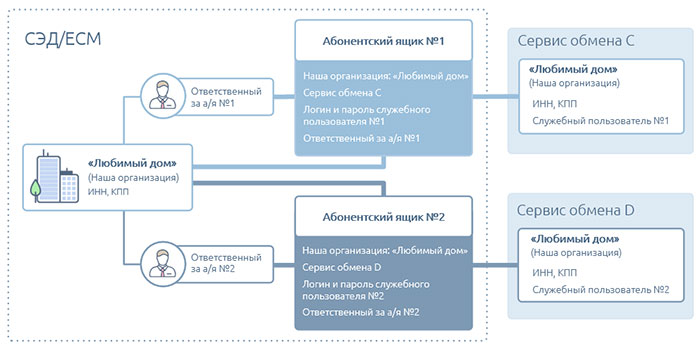 У компании «Любимый дом» из нашей истории есть желание работать сразу с двумя сервисами. В этом случае нужен свой абонентский ящик для каждого сервиса обмена. Таким образом схема, которую нужно настроить администратору, выглядит вот так:
