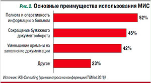 | РМИС для врачей – плюсы и минусы Основным преимуществом использования РМИС опрошенные iKS-Consulting врачи и ИТ-специалисты, работающие с этими системами, называют возможность оперативного получения полной информации о пациенте (результаты анализов и исследований, данные о деменциях, сведения о госпитализации и т.п.) – этот фактор отметили чуть больше половины респондентов (рис. 2). Опрошенные также признают, что работа с МИС ведет к сокращению бумажного документооборота и значительно меньше времени тратится на заполнение медицинской документации. Кроме того, респонденты отмечали, что благодаря МИС ускоряется поиск необходимой информации о больном, улучшается взаимодействие между подразделениями, появилась возможность просмотра статистики и получения аналитических справок.