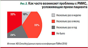 Треть респондентов не сталкивались с проблемами РМИС, которые приводили бы к усложнению процесса приема пациента (рис. 3). Но 29% из них эксплуатируют систему менее года и, возможно, просто не успели с ними столкнуться, а остальные 71% работают с системой достаточно долго и знают о способах быстрого восстановления работы с системой или имеют четкий отработанный алгоритм действий на этот случай. Максимальный срок простоя МИС из-за сбоев, по результатам опроса, составляет не более 4 часов. Всего 12% опрошенных сказали, что во время сбоя системы могут продолжать работу в локальной копии и после восстановления все данные синхронизируются. Остальные вынуждены фиксировать необходимую информацию в Excel или на бумажных носителях и позже вручную вносить ее в систему.![]() |