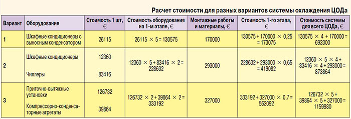 Итак, применяем двухконтурные шкафы, холодопроизводительность NET каждого шкафа составляет 65 кВт. В каждом машинном зале устанавливаем четыре рабочих и один резервный кондиционер. Расчет стоимости оборудования приведен в таблице. Как видно, на первом этапе система кондиционирования, включая монтажные работы (стоимость которых равномерно распределяется на все этапы), обойдется в 173 075.