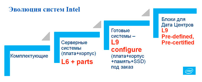 Таким образом, получаем более глубокую модель интеграции: L6 – это интеграция для серверов на уровне шасси и материнской платы, а L9 – это уже рабочая система, где установлены микропроцессоры, оперативная память и дополнительные компоненты. Иными словами, если раньше мы отдавали платформу для сборки интеграторам (L6 плюс дополнительные компоненты), то сейчас мы предлагаем уже готовое решение – L9, или Intel Datacenter Blocks.