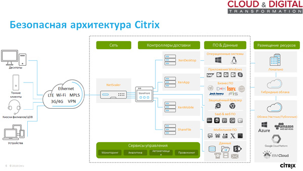 Citrix предлагает подход, в рамках которого пользователь может работать с любым подключенным к сети устройством. Контроллеры доставки Citrix направляют запросы пользователя к приложениям и данным, причем ресурсы могут размещаться локально, в частных облаках организации и даже в публичных облаках крупнейших провайдеров.