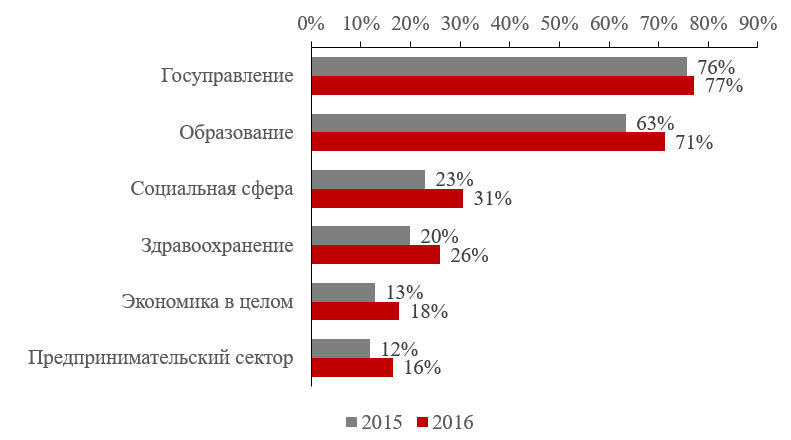 Согласно оценкам iKS-Consulting, в 2016 году численность предприятий и организаций, использующих СЭД, увеличилась во всех основных секторах экономики России (рис. 2). Однако значительное увеличение проникновения СЭД в большей степени было обусловлено снижением общей численности зарегистрированных предприятий и организаций.