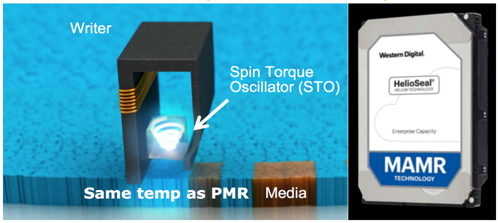 В индустрии есть понимание, что для более существенного прироста требуются методы революционные, обеспечивающие энергетическую поддержку магнитной записи. Она может обеспечиваться за счет встраивания в головку диска лазера, нагревающего пластину перед записью по технологии термомагнитной записи (HAMR) или за счет микроволновой поддержки (технология МАМR). Из двух инновационных технологий компания Western Digital выбрала разработанную ее специалистами технологию МАМR, позволяющую значительно увеличить плотность записи без дополнительных источников тепла в диске, а значит, и без потенциальных рисков с точки зрения надежности.