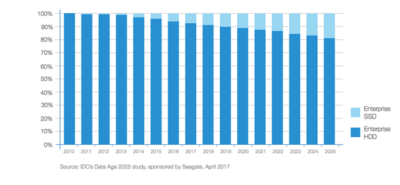 По мере роста объемов продаж HDD и SSD будет увеличиваться емкость накопителей обоих типов. Поскольку для многих приложений использование SSD дает преимущества, флеш-накопители станут постепенно заменять жесткие диски во всех сценариях, кроме тех, где требуется большая емкость хранилища. Доля SSD в объеме продаж накопителей увеличится, однако общий рост объемов данных приведет к повышению спроса как на SSD, так и на жесткие диски.