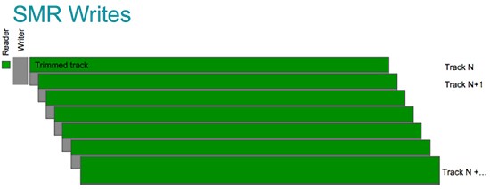 Увеличению плотности хранения и общей емкости накопителя служит и технология черепичной магнитной записи (Shingled Magnetic Recording, SMR). Суть технологии в том, что новая записываемая дорожка перекрывает часть ранее записанной дорожки (рис. 5). Предыдущая дорожка сужается, т.е. плотность записи повышается. Этот подход был выбран потому, что из-за физических ограничений записывающие головки нельзя сузить настолько же, насколько считывающие головки.