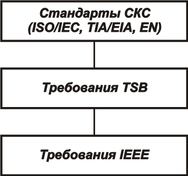 До последнего времени официальная фиксация параметров кабельной техники выполнялись фактически несколько раз, причем процессы стандартизации были во многом независимы друг от друга. Такое положение определялось особенностями разработки стандартов, которые из-за разных требований к предельно допустимым значениям образовали иерархическую структуру (рис. 1).