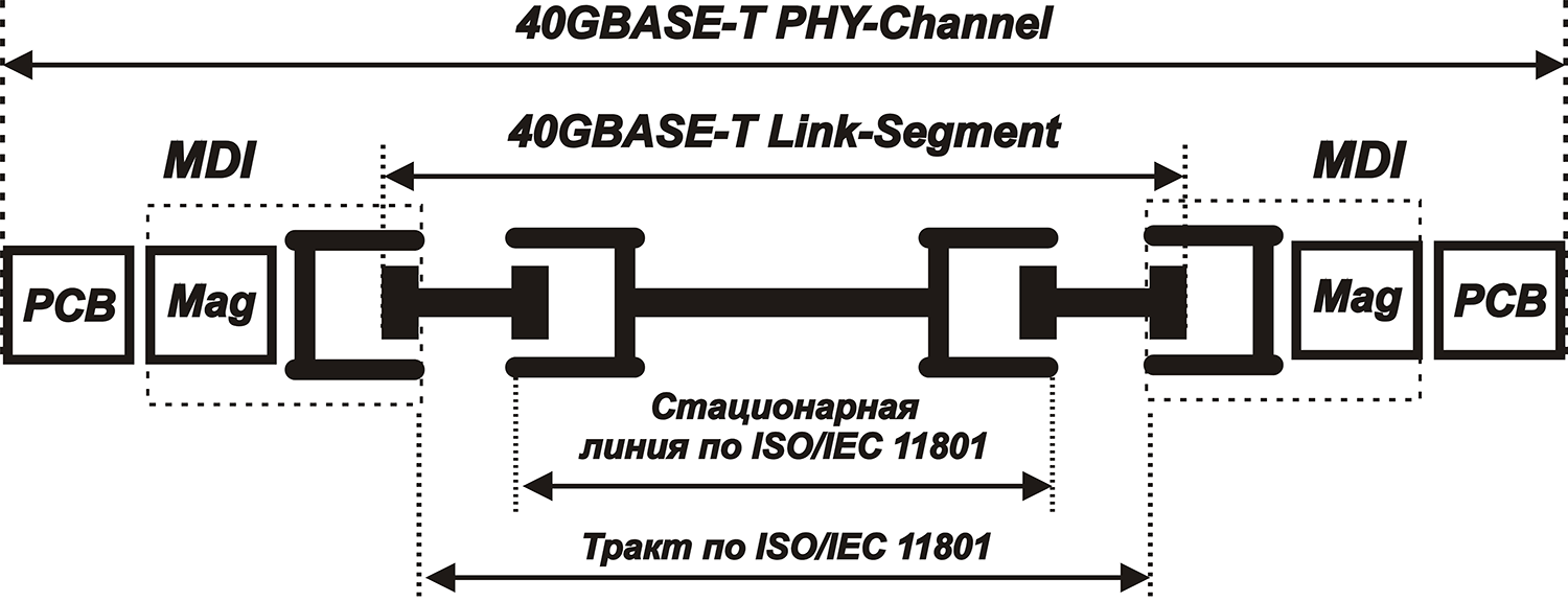 Параметры линии стандарта IEEE 802.3bq оптимизируются исходя из полной вложенности четырех комплексных объектов (рис. 2). Два из них являются классической стационарной линией и полным простым трактом СКС. Так называемый 40GBase-T Link-Segment представляет собой тракт СКС, дополненный двумя вилками соединительных шнуров. Полный физический тракт 40GBase-T PHY-Channel заканчивается на обоих концах выходом печатной платы PCB линейного модуля сетевого интерфейса. Это важно с аппаратурной точки зрения, так как позволяет унифицировать по посадочным местам и раскладке контактов электропроводный и волоконно-оптический варианты сетевого интерфейса. Вложенный характер комплексных объектов и их заранее известные характеристики не только обеспечивают бесшовный переход между аппаратурой и пассивной частью канала связи, но и позволяют улучшить качество связи за счет точного согласования их параметров.
