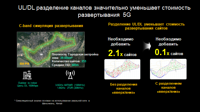Разделение каналов «вверх» (от абонента) и «вниз» (к абоненту) позволяет максимизировать покрытие сети 5G в C-диапазоне и повысить качество обслуживания пользователей при уменьшении инвестиций в дополнительные сайты.