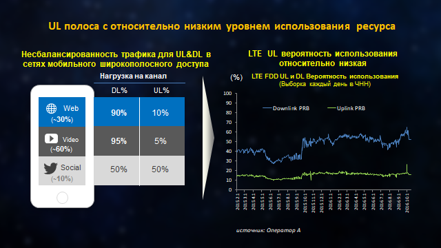 Если рассмотреть использование полосы конечными пользователями (рис. 2), то окажется, что канал «вверх» занят с вероятностью 15–20%, а канал «вниз» – с вероятностью 40–60%. Такой дисбаланс обусловлен тем, что большую часть времени абоненты используют мобильное устройство для доступа в интернет (примерно 30% времени) и просмотра видео (примерно 60% времени). При этом соотношение нагрузки на каналы DL и UL составляет 90/10 для доступа в интернет и 95/5 для просмотра видео. Только социальные сети, где пользователи проводят 10% своего времени, создают сбалансированную нагрузку на каналы UL и DL (примерно 50/50).