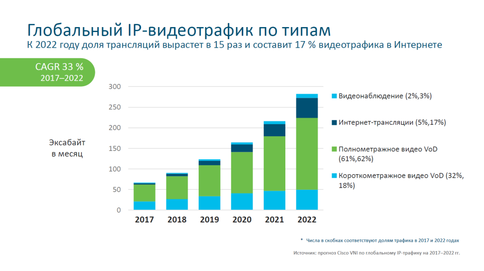 Эксперты Cisco отдельно подсчитывают IP-трафик и интернет-трафик. Различие в том, что в первой характеристике дополнительно учитывается корпоративный IP-трафик, например IP VPN, который не выходит в интернет. В России в 2022 году объем интернет-трафика составит примерно 130 Эбайт. Таким образом, по оценке экспертов Cisco, IP-трафик за пределами интернета займет лишь 6% в общем объеме IP-трафика.