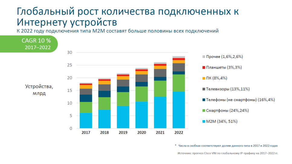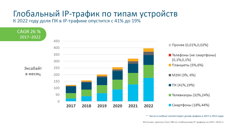 Такой прогноз содержится в очередном исследовании Visual Networking Index (VNI), представленном компанией Cisco и посвященном тому, как будут развиваться глобальные IP-сети в период до 2022 года. Подробные прогнозы по российскому сегменту интернета компания опубликовала впервые.В ближайшие несколько лет глобальный IP-трафик будет увеличиваться в среднем на 26% в год, и в 2022 году его объем достигнет 4752 эксабайт (1 Эбайт = 1018 байт). Для сравнения: по данным IDC, общий объем цифровой информации, имеющейся на земном шаре, в 2006 году равнялся 161 Эбайт. В России за 2022 год, по прогнозу, будет передано 139 Эбайт, что составит примерно 3% общемирового показателя.