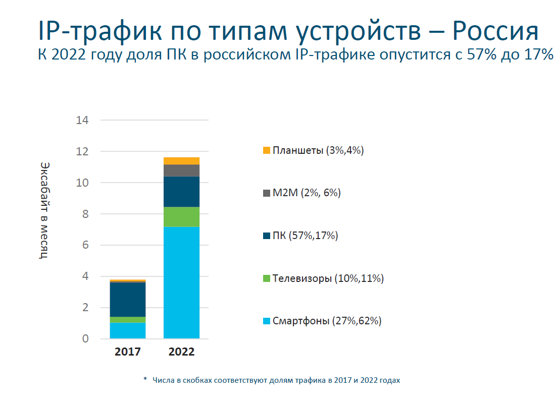 Ситуация в России будет в основном соответствовать общемировой. Отметить стоит разве что вдвое меньший вклад в IP-трафик «умных» телевизоров. За период 2017–2022 годов в нашей стране произойдет девятикратный рост трафика M2M, но его доля, как и во всем мире, составит скромные 6%.
