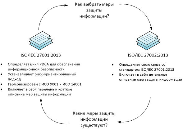 Подход к управлению информационной безопасностью в настоящее время определяется двумя взаимосвязанными стандартами: ISO/IEC 27001 и ISO/IEC 27002 (рис. 3). Основную роль здесь играет стандарт 27001, содержащий рекомендации по менеджменту ИБ в организации на основе широко используемого в корпоративной среде цикла управления качеством PDCA (Plan, Do, Check, Act). Стандарт ISO/IEC 27002 носит скорее справочный характер, описывая набор возможных мер защиты информации, из которых организация может выбрать необходимые именно ей.