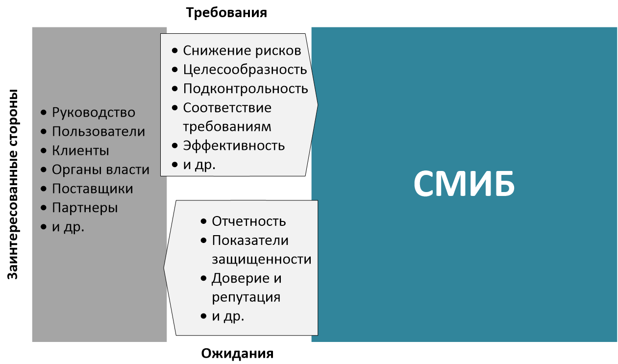 Стандарт ISO/IEC 27001 дает рекомендации по функционированию СМИБ как комплексной системы, направленной на защиту информационных активов организации от угроз и, следовательно, минимизацию рисков. С точки зрения бизнеса СМИБ представляет собой одну из множества систем организации, к которой предъявляются определенные требования и которая должна оправдать ожидания и вернуть вложенные в нее средства (рис. 4).