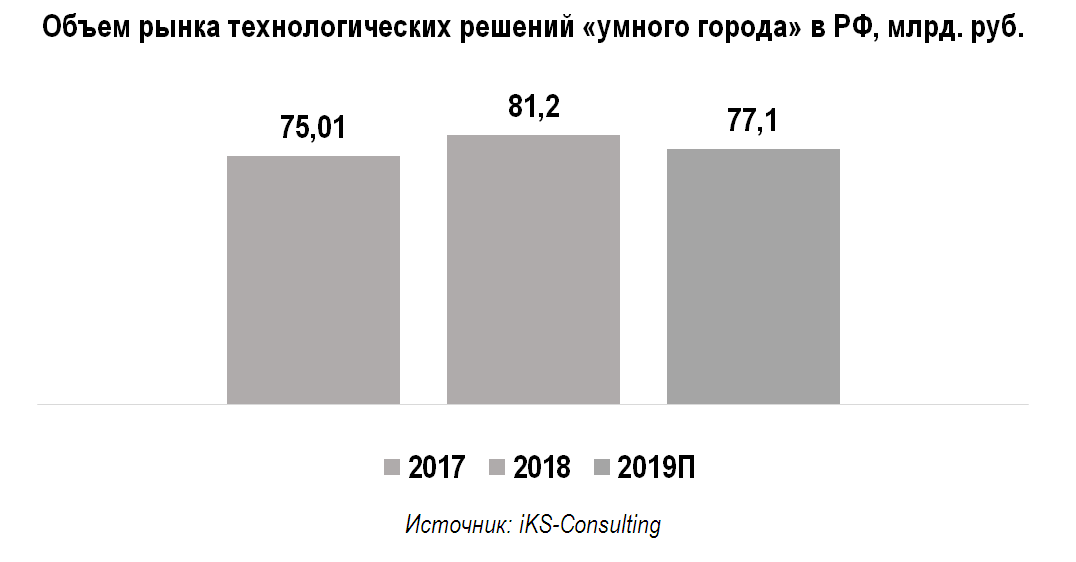 Объем рынка цифровых решений «умного» города, по оценкам iKS-Consulting, в 2018 году превысил 81 млрд руб. По сравнению с 2017 годом рост составил порядка 8%. Такие данные приведены в представленном аналитиками отчете «Итоги развития рынка технологических решений для «умного» города». Аналитики определяют данный рынок как комплекс ИКТ-решений для автоматизации функций управления различными подсистемами городского хозяйства, его жизнеобеспечения и обслуживания, реализуемых в рамках концепции «умного» города.