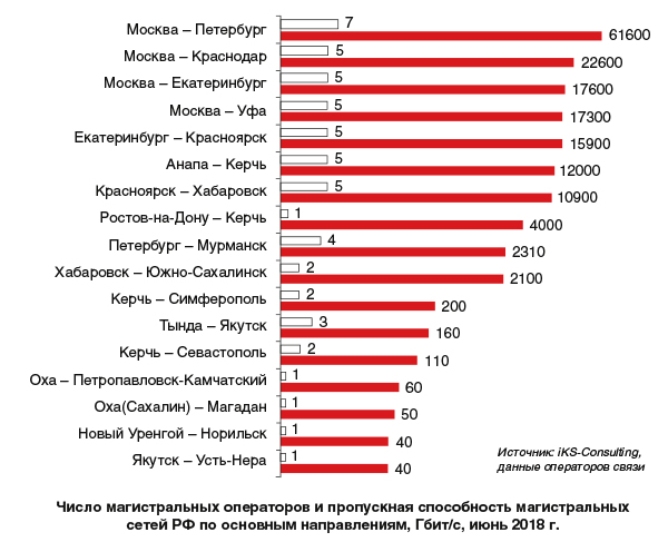 Несмотря на огромные расстояния и относительно низкую плотность населения, в настоящее время в России построена разветвленная оптическая сеть с множественным резервированием маршрутов, охватывающая практически всю территорию страны с запада на восток. Пропускная способность этой сети на направлении Москва – Санкт-Петербург превышает 60 Тбит/с, Москва –Хабаровск – 10 Тбит/с, а еще на восьми направлениях – 2 Тбит/с (рис. 2). Задержки в этой сети определяются в первую очередь географической удаленностью объектов. Существенный и относительно легко – благодаря возможностям технологий плотного спектрального уплотнения (DWDM) – расширяемый запас пропускной способности позволяет минимизировать джиттер и потери пакетов. При этом Сочи, город в 2014 г. принимавший Олимпиаду, подключен к сети каналами с общей пропускной способностью 680 Гбит/с, а каналы Ростов -- Керчь и Анапа -- Керчь обеспечивают в общей сложности скорость 12 Тбит/с: магистрали построены с заметным запасом, в надежде на быстрое экономическое развитие Крыма, в котором с 2015 г. действуют свободные экономические зоны, а в 2018 г. принято решение о создании ИТ-парка в Севастополе.