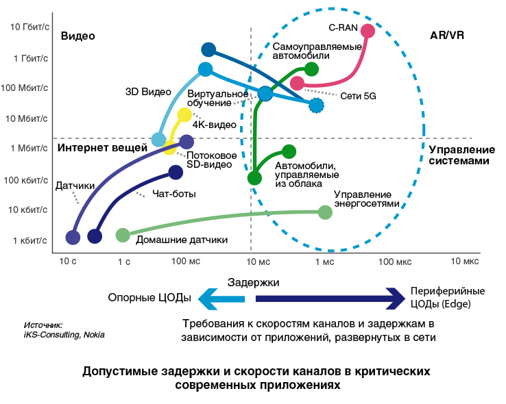 Следующим этапом стало появление в интернете нового класса устройств: машин, станков, контроллеров и промышленных механизмов – цифровая экономика поставила задачу формирования промышленного интернета и уменьшения задержек до одной и менее миллисекунды. В транспортных сетях 5G допустимые задержки исчисляются десятками микросекунд. Высокочастотный трейдинг и периферийные вычисления (Edge Computing) делают актуальными еще меньшие задержки – в пределах 1–10 мкс. Для синхронного реплицирования данных в критических приложениях предельные значения задержек составляют десятые доли, максимум – единицы миллисекунд, и соответственно расстояния между дата-центрами в пределах от 40 (в случае использования Fibre Channel) до нескольких сотен километров (iSCSI).