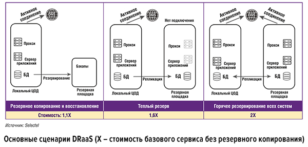 Понятно, что вариантов реализации сервиса DRaaS может быть много, а выбор определяется двумя основными параметрами: RTO – время восстановления работоспособности ИТ-системы и RPO – время, за которое возможна потеря данных. Компания Selectel считает, что существуют три основных сценария (рис. 4):
