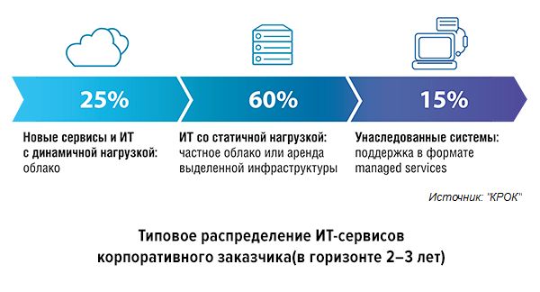 Согласно исследованию "КРОК", в ближайшие несколько лет корпоративные заказчики в среднем будут переносить в облако только около 25% всех ИТ-сервисов (рис. 1). Как правило, это сервисы с явно выраженными пиковыми или динамично изменяющимися нагрузками либо создаваемые под новый бизнес, который может и не пойти, а значит, соответствующие ИТ-сервисы придется сворачивать. Подобные задачи отлично ложатся в облако. Около 60% ИТ-сервисов крупные корпоративные заказчики со сложившейся ИТ-инфраструктурой обычно размещают в своем ЦОДе или в частном облаке, реализованном в коммерческом ЦОДе. Наконец, оставшиеся 15% – это унаследованные ИТ-системы, построенные на «железе», отличном от платформы x86, и/или на экзотическом ПО. Такие системы с облаками «не дружат».