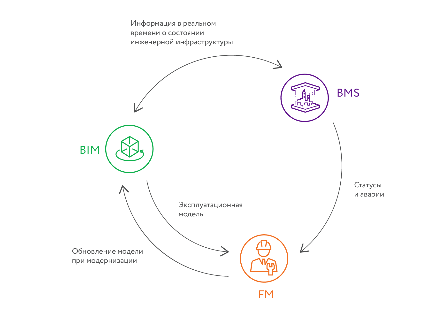В настоящее время для эффективного управления объектом существуют два основных инструмента – система диспетчеризации и автоматизации (BMS или SCADA) и система управления эксплуатацией здания (Facility management, FM). Первая используется в качестве источника информации об инженерной инфраструктуре. Вторая система предназначена для организации и автоматизации работы службы эксплуатации, выдачи и контроля задач исполнителям. Другими словами, FM-система помогает принимать и обрабатывать заявки от пользователей, автоматически формирует наряды на ремонт и обслуживание оборудования, хранит всю эксплуатационную документацию.
