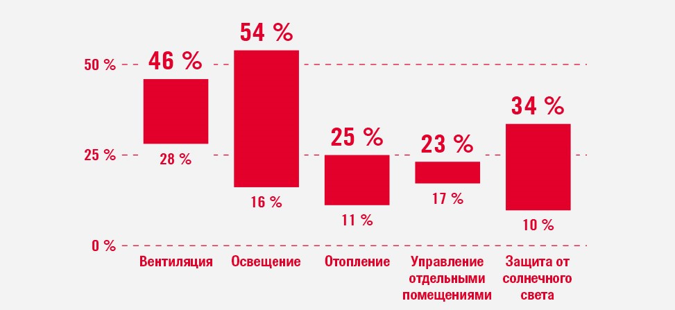 Рис. 1. Потенциал экономии энергии при использовании автоматизированной системы управления зданием (мин./макс.)