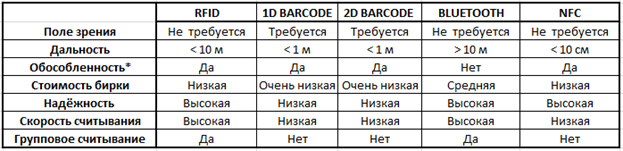 RFID-метки – не единственный метод, который используется для отслеживания багажа. Есть также 1D- и 2D-Barcode, Bluetooth и NFC – у каждой технологии свои особенности, сравнить их можно с помощью приведенной ниже таблицы.