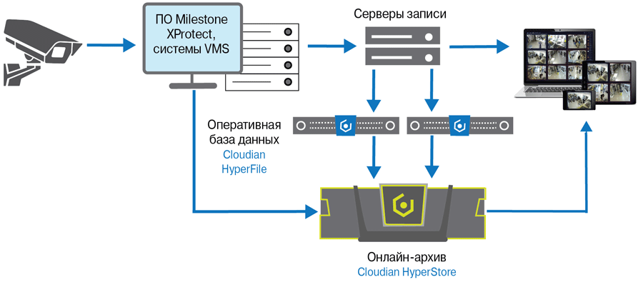 Рис. 2. Системы хранения Cloudian HyperFile и HyperStore с ПО Milestone XProtect