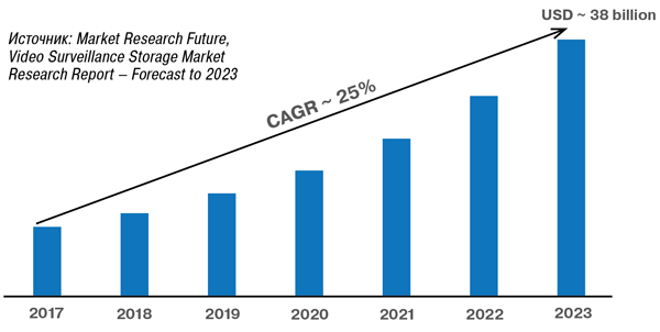Согласно недавнему отчету MarketsandMarkets, мировой рынок видеонаблюдения вырастет с почти $37 млрд в 2018 г. до более чем $68 млрд в 2023 г. В основном этот рост обусловлен продолжающимся переходом от аналоговых систем видеонаблюдения к системам на основе IP. Снижение стоимости IP-камер способствует широкому применению этих систем во всем мире, подстегивая спрос на качественные и экономичные решения для хранения данных (рис. 1).
