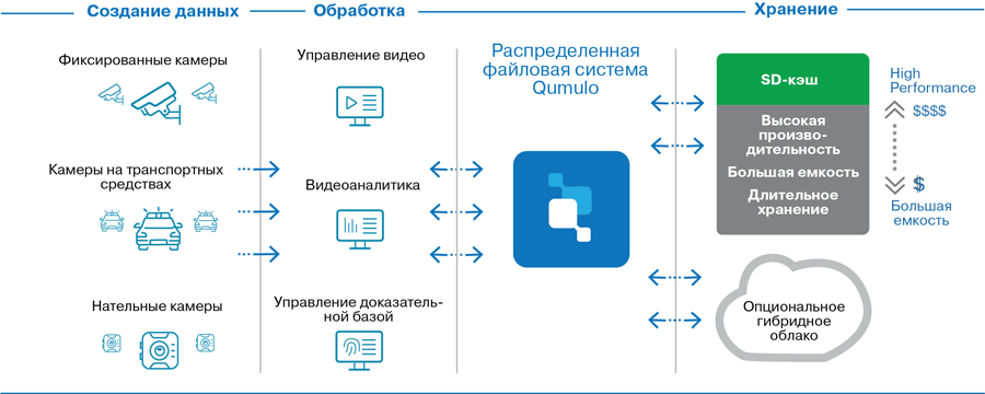 Другой вариант распределенной системы предлагает компания Qumulo (рис. 3). Видеозаписи с камер видеонаблюдения разного типа сохраняются в распределенной файловой системе Qumulo и размещаются на разных уровнях хранения: SSD для оперативной аналитики, на дисках большой емкости или опционально – в облаке.