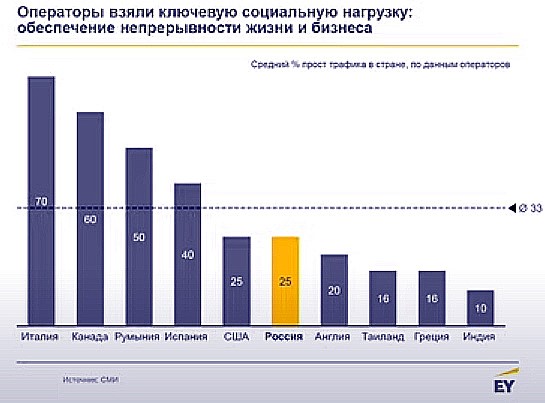 Операторы связи взяли на себя часть социальной нагрузки по обеспечению непрерывности жизни и бизнеса, частично обнулили стоимость трафика социально значимых ресурсов, увеличили объем трафика, включенный в те или иные пакеты, в некоторых странах Европы ввели бесплатные звонки за границу, отменили штрафы за несвоевременную оплату счетов.
