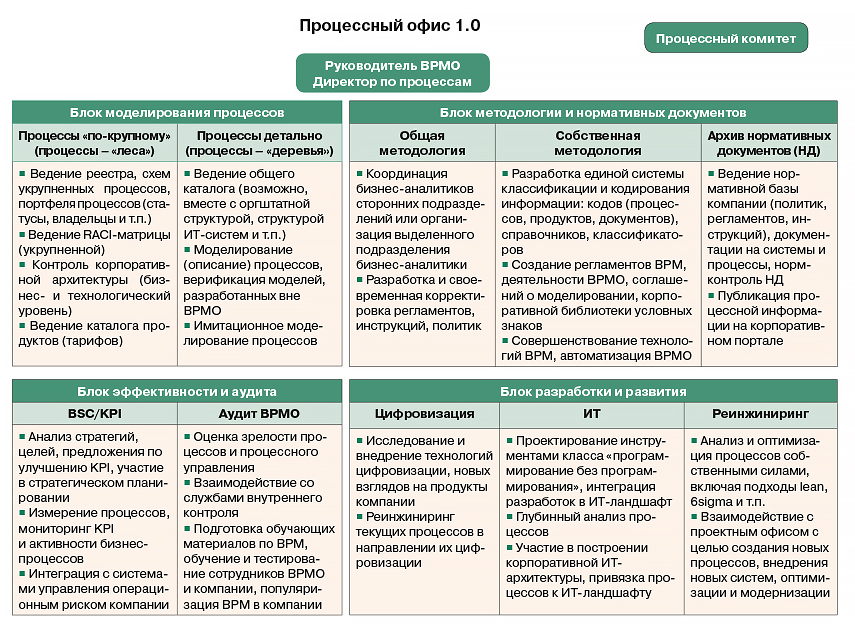 BPMO должен стать центром компетенции по процессам компании: он осуществляет детальный учет процессов (аналогично бухгалтерскому учету), фиксацию текущего состояния и моделирование процессов, управление их изменениями, измерение и аудит, эволюционный «улучшайзинг» и революционный реинжиниринг, цифровизацию и т.п. На схеме показана развернутая конфигурация процессного офиса в версии 1.0. На практике процессные офисы включают обычно только часть указанных блоков.