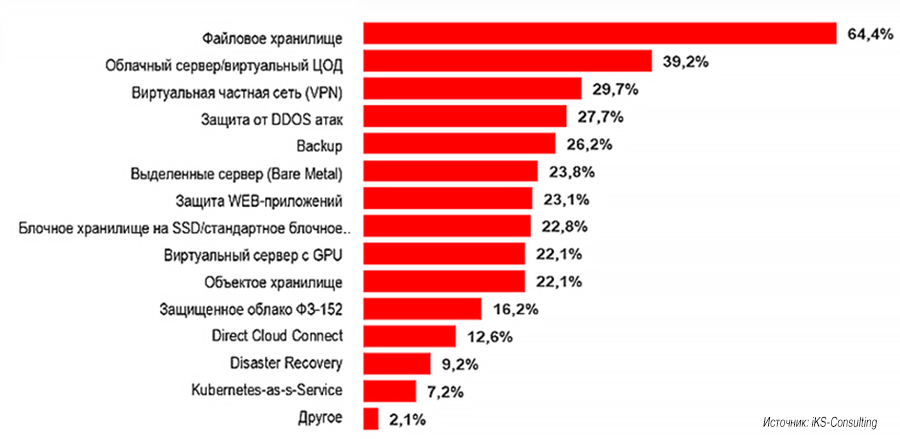 Что касается сервисов, то в бизнесе, как и у конечных пользователей, самой популярной облачной услугой, которую отметили 64% респондентов, опрошенных iKS-Consulting, остается файловое хранилище (рис. 1). Облака используют как круглосуточно доступный архив, как банк данных с разграничением доступа на скачивание.