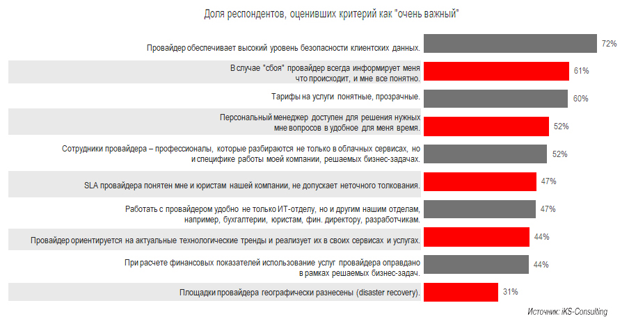 Важна и прозрачность тарифов на услуги (60%) – неприятно узнавать, что кто-то заплатил за ту же облачную услугу значительно меньше. Конечно, ценообразование может быть сложным, например, как у AWS, но в любом случае оно должно быть понятным, пусть даже для учета всех тонкостей надо приложить много усилий.