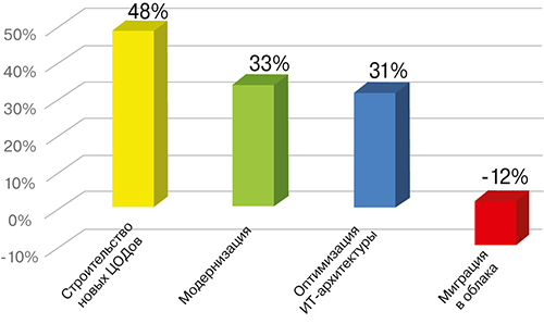 Количество ЦОДов, нуждающихся в реконструкции, растет с каждым годом. Например, по статистике, в Германии в 2016 г. доля затрат на модернизацию дата-центров увеличилась на 33%, в то время как доля затрат на перенос данных в облака уменьшилась на 12% (рис. 1). В 2019 г. рост доли затрат на реконструкцию, согласно различным источникам, составил от 47 до 53%.
