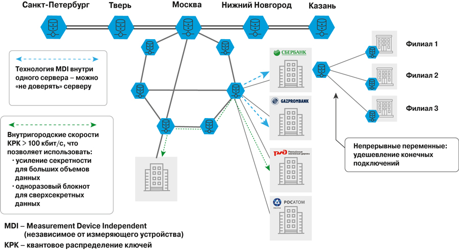 В июне 2016 г. сотрудники «Российского квантового центра» (РКЦ) соединили квантовой связью два здания Газпромбанка в Москве. В мае 2017 г. специалистам РКЦ удалось создать многоузловую гетерогенную квантовую сеть передачи данных. Ученые смогли применить одновременно два метода шифрования данных в одной сети. На одном участке сети информация шифровалась путем поляризации фотонов (этот метод разработан в РКЦ), во втором задействовалась их фаза.