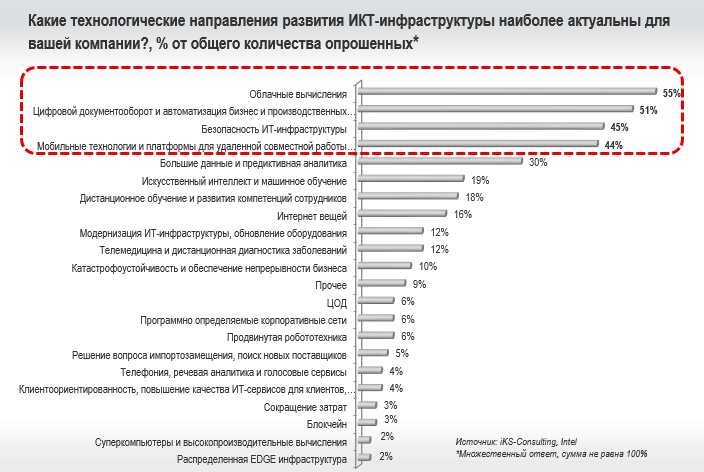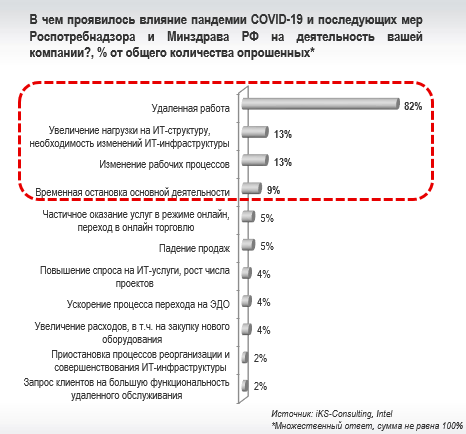 Сегодня важно оценить, как события 2020 года изменят тактику и стратегию цифровой трансформации, как повлияют на модернизацию ИКТ-инфраструктуры. Одно из первых серьезных исследований этих вопросов в России, выполненное совместно iKS-Consulting и Intel, показало существенное влияние пандемии на ИТ-процессы в компаниях, а также выявило основные приоритеты развития ИКТ-инфраструктуры.