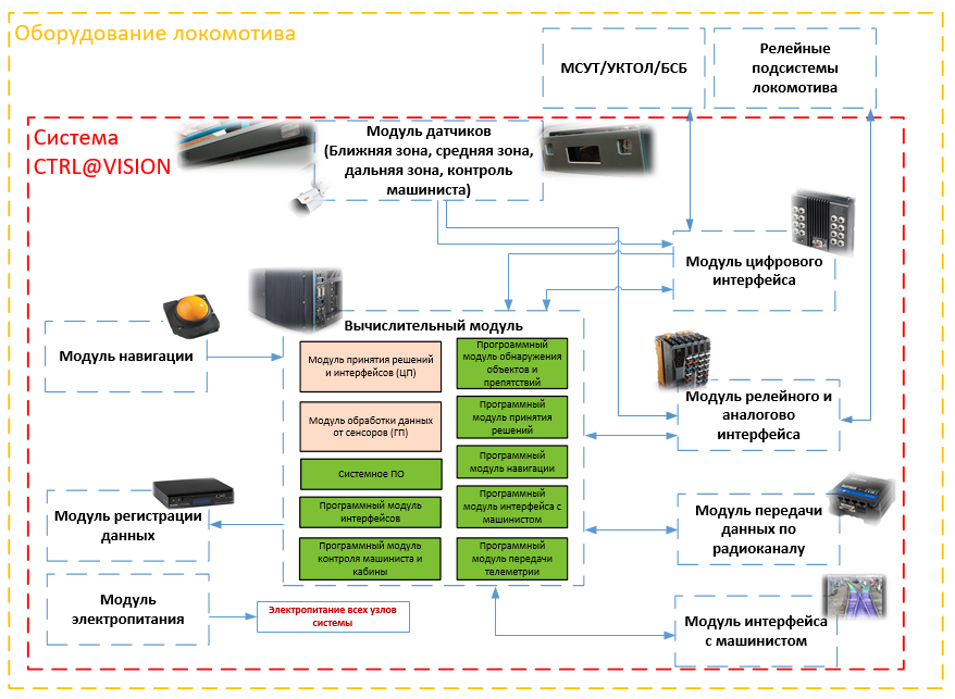 Принцип работы системы машинного зрения локомотива основан на комплексировании данных от различных сенсоров, которые установлены с каждой его стороны по ходу движения. Обработка данных ведется на высокопроизводительном вычислителе с использованием алгоритмов обнаружения объектов и препятствий, находящихся в различных зонах. По результатам вычислений система принимает решение о необходимых действиях (подача звукового сигнала, набор/сброс тяги, снижение скорости служебным или экстренным торможением) за счет взаимодействия с системой управления и диагностики и системой торможения локомотива.