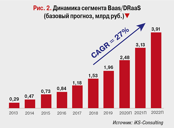 По оценкам iKS-Consulting, российский рынок облачного резервирования и аварийного восстановления составляет примерно 9% общего объема рынка IaaS, в 2017–2018 гг. его объем достиг соответственно 1,2 и 1,5 млрд руб. (рис. 2), увеличившись за год соответственно на 40 и 30%.