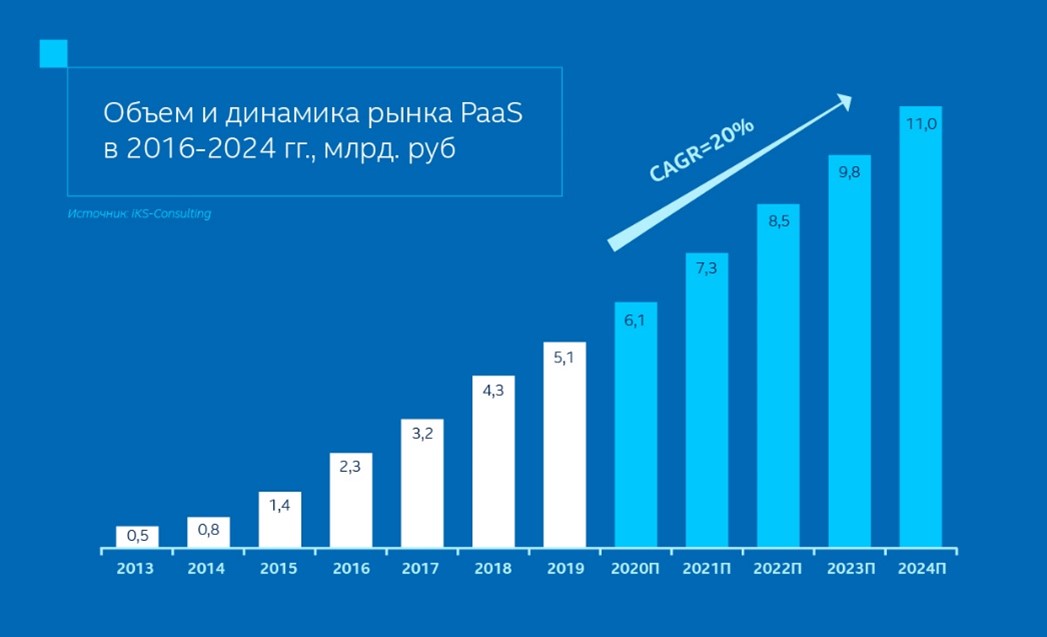 Пандемия COVID-19 подстегнула использование облачных сервисов. В 2019 году объем российского рынка PaaS-решений составил 5,1 млрд рублей. По прогнозам авторов исследования, к 2021 году рынок вырастет до 6,1 млрд рублей, тогда как в 2016 году его объем равнялся 2,3 млрд рублей. Главными драйверами роста станут специализированные платформы, которые будут использоваться для разработки и тестирования новых продуктов, а также для внедрения проектов у заказчиков в случае необходимости быстрого развертывания систем. В исследовании отмечается, что к 2024 году объем рынка достигнет почти 11 млрд рублей.